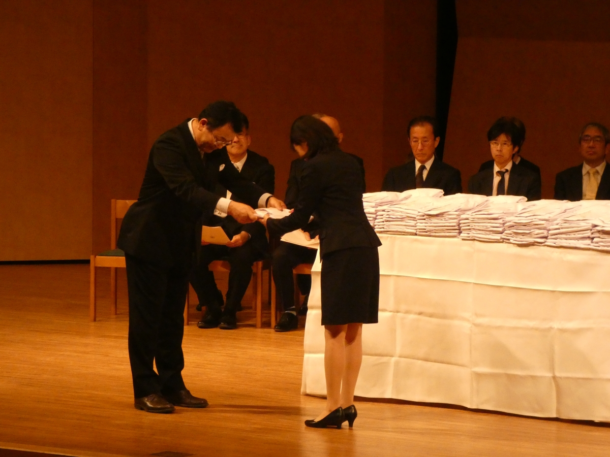 式典は京田辺キャンパス 新島記念講堂にて礼拝形式で行われ、飯田学長から式辞をいただいたあと、芝田薬学部長より白衣が一人一人に手渡されました。また学生代表が、医療人としての自覚と責任感を持って実習に臨むと誓いの言葉を述べました。